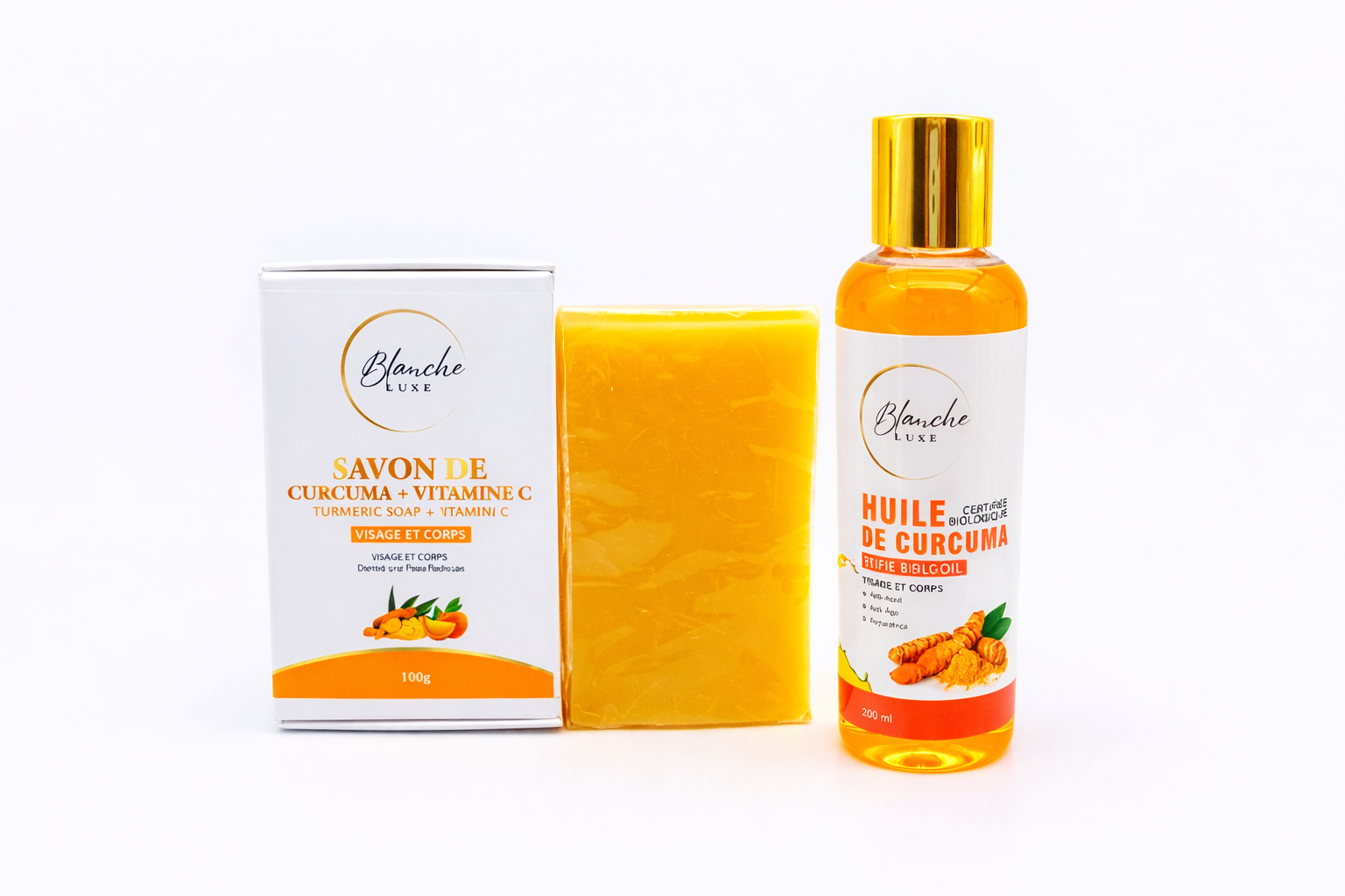 Le Duo Curcuma Blanche Luxe associe deux soins complémentaires essentiels pour une routine complète visage et corps : le Savon Curcuma + Vitamine C et l’Huile de Curcuma certifiée biologique. Ensemble, ils offrent une action globale pour nettoyer, réparer, illuminer et sublimer la peau au quotidien.